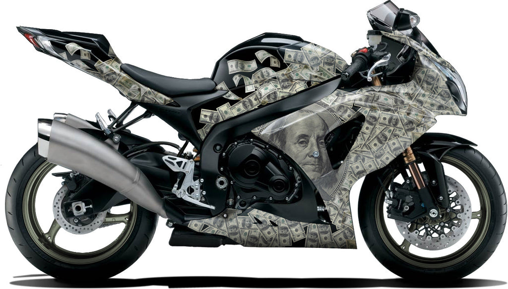 Dollar Dollar Bills Yal, a wrap devoted to Ben and his money motorcycle vinyl wrap. This design can be produced in different background colors.Â