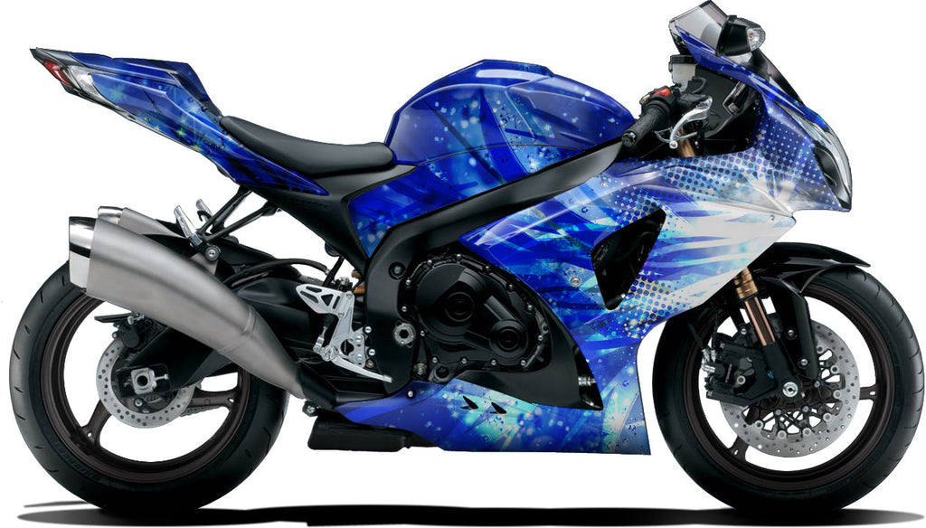 Fantasy design shown in blue, this new design motorcycle vinyl wrap is inspired by a mix of custom designs.Â