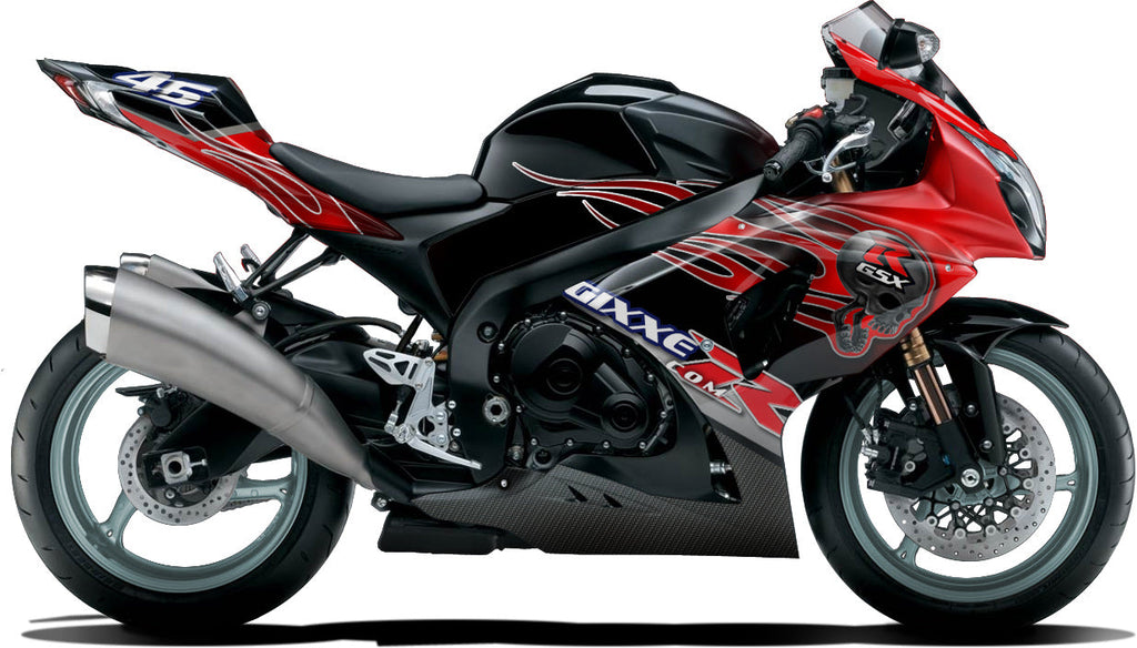 The Gixxer. If you love Gixxers this may be the motorcycle vinyl wrap for you. This design features flames, skulls, and carbon fiber-does it get any better?Â