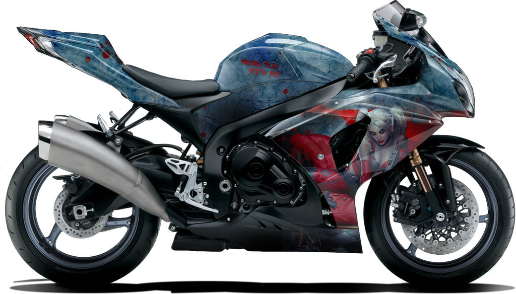 The Harley Quinn motorcycle vinyl wrap. This design can be produced in different background colors.Â