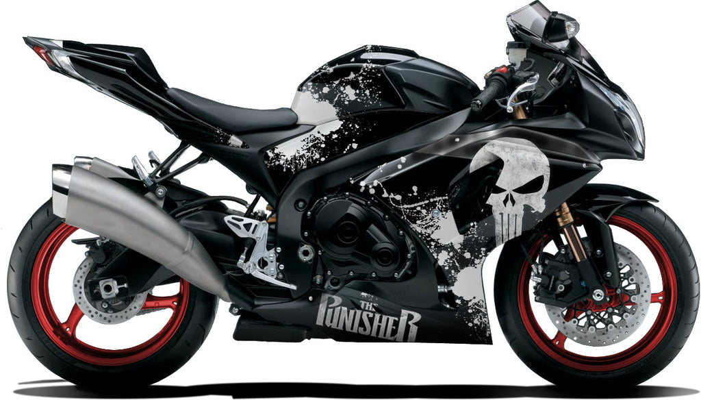 The Punisher Motorcycle Vinyl Wrap. This design can be re-positioned for different fairings and produced in different background colors.Â